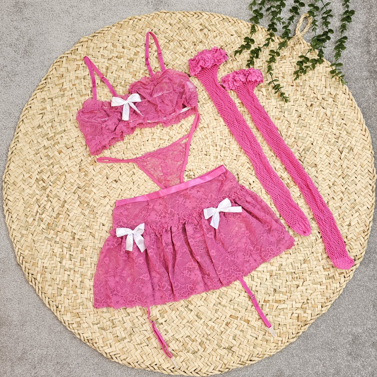 ست لباس زیر گیپور مدل A1885 با رنگ خاص صورتی رز، انتخابی لوکس و رمانتیک برای بانوانی است که به جذابیت و لطافت خود اهمیت میدهند.