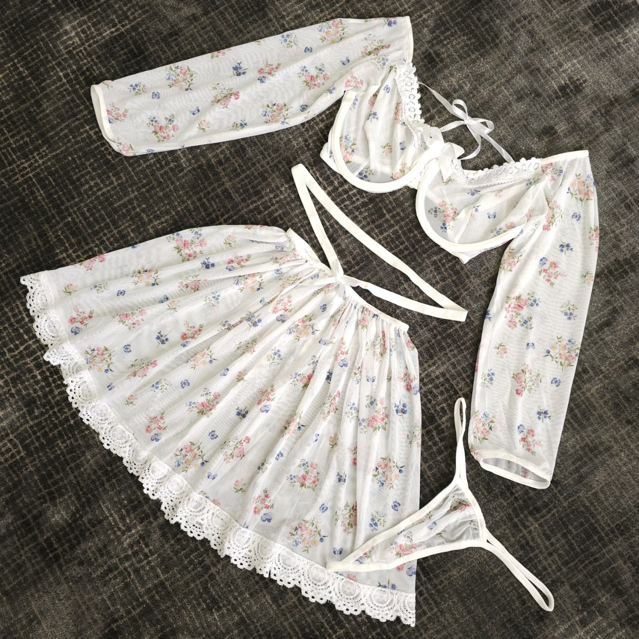 دامن فانتزی کوتاه با حاشیهی گیپوری سفید و بند ساتن ظریف، طراحی این ست رو خاصتر کرده 💕