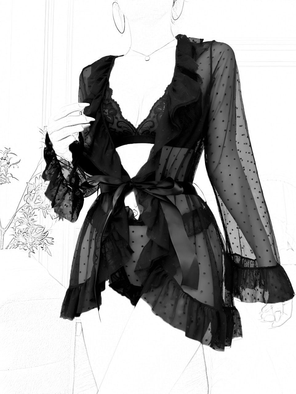 لباس خواب یکتکه توری مشکی با طراحی سهتکه (شورت، سوتین و روپوش)، از ترکیب توری و دانتل تهیه شده و ظاهری فوقالعاده جذاب و فانتزی دارد. توری بهکار رفته در این لباس خواب باعث جریان بهتر هوا روی پوست میشود و همین ویژگی آن را برای استفاده در فصول گرم یا شبهای طولانی، بسیار مناسب کرده است.